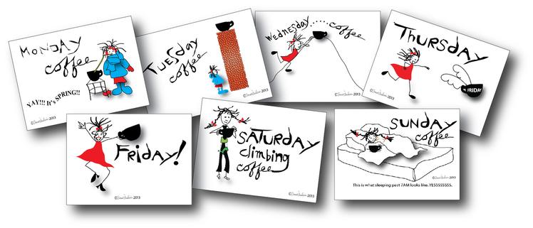 CG and her husband, David. David said "I don't care WHAT you draw, just draw SOMETHING every single day. Even it is a STICK FIGURE." And so, it started, literally, with a stick figure and a day of the week -- a simple little stick figure drawing of a character that resembled CG as a girl. The rest, they say, is history. She's become an entity of her own. With coffee, of course.